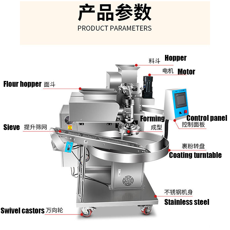 Simply place dough and filling into the feed inlet; upon activation, the machine performs filling, shaping, coating, sifting, lifting, and conveying processes. Both dough and filling conveyance employ twin-screw auger mechanisms with digital variable-frequency control, allowing precise adjustment of dough/filling throughput and product weight.