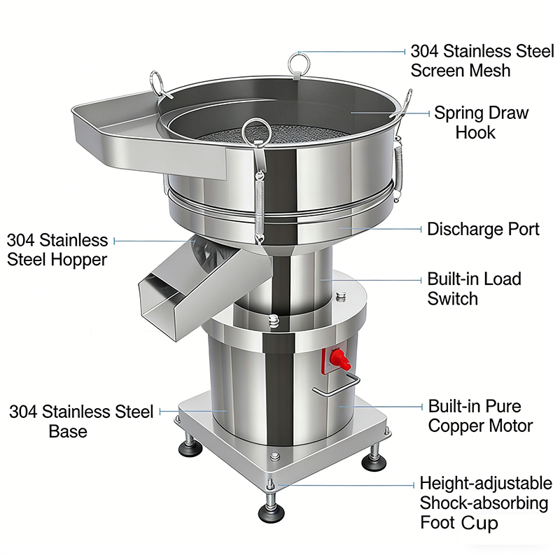 A3: Its smooth stainless steel surface and simple structure allow easy cleaning—just wipe with a damp cloth or rinse with clean water. Regularly check the vibration motor and screen mesh for wear to ensure long-term stable operation.