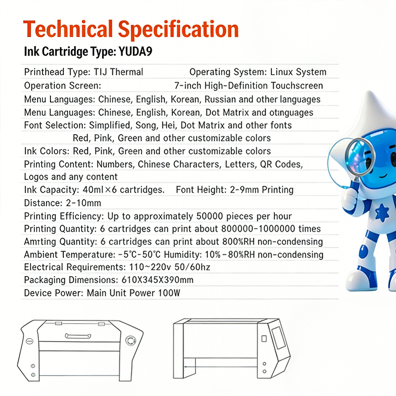 This egg printing machine features a main unit measuring 560 × 370 × 285 mm with a net weight of approximately 16 kg, and packing dimensions of 610 × 345 × 390 mm. It adopts a TIJ thermal inkjet print head and uses YUDA9 ink cartridges, equipped with a 7‑inch HD touch screen and Linux operating system, supporting Chinese, English, Korean, Russian and other interface languages. The machine is configured with 6 ink cartridges of 40 ml each, with a print head quantity of 1–6 heads (customizable), offering a font height of 2–9 mm and a printing distance of 2–10 mm. It reaches a maximum printing speed of 50,000 eggs per hour, and one set of cartridges can print about 800,000 to 1,000,000 times. It operates stably at -5°C to 50°C and 10%–80% RH (non‑condensing), with a power supply of 110~220V 50/60Hz and power consumption of 100W for the main unit. It is compatible with egg washing machines, grading machines and packing machines, and supports customization including extended conveyor belts and multi‑language functions.
