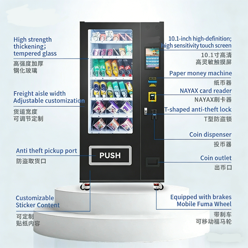 The Automatic Vending Machine is an intelligent unattended retail equipment that realizes automatic cargo dispensing and instant transaction through multiple payment methods. It can store and sell a variety of daily consumer goods in a sealed and intelligent storage space, effectively meeting the immediate shopping needs of people in various scenarios with high mobility and diverse consumption demands. Especially suitable for office buildings, railway stations, airports, colleges and universities, residential communities, hospitals, gas stations, gyms and shopping malls, etc.