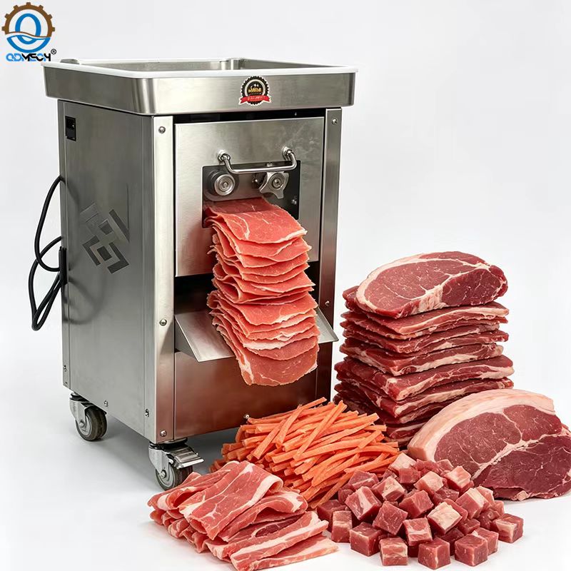 This stainless steel meat cutting machine is widely used in commercial kitchens, butcher shops, food processing plants, and catering establishments. It efficiently slices, strips, and dices various types of meat, including pork, beef, and poultry, making it an essential tool for large-scale food preparation. With its adjustable thickness settings (3.5mm-5mm) and interchangeable blades, it meets diverse cutting requirements for different culinary applications.