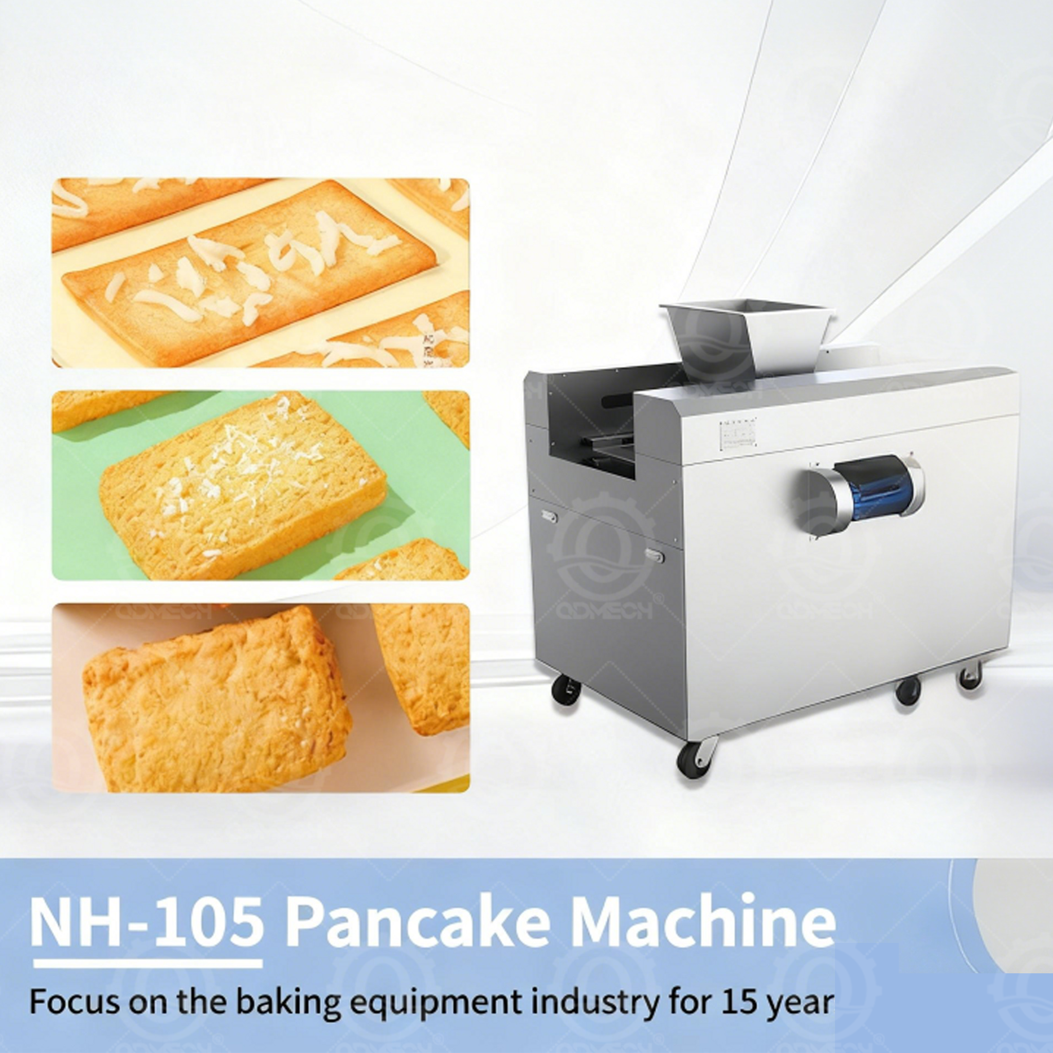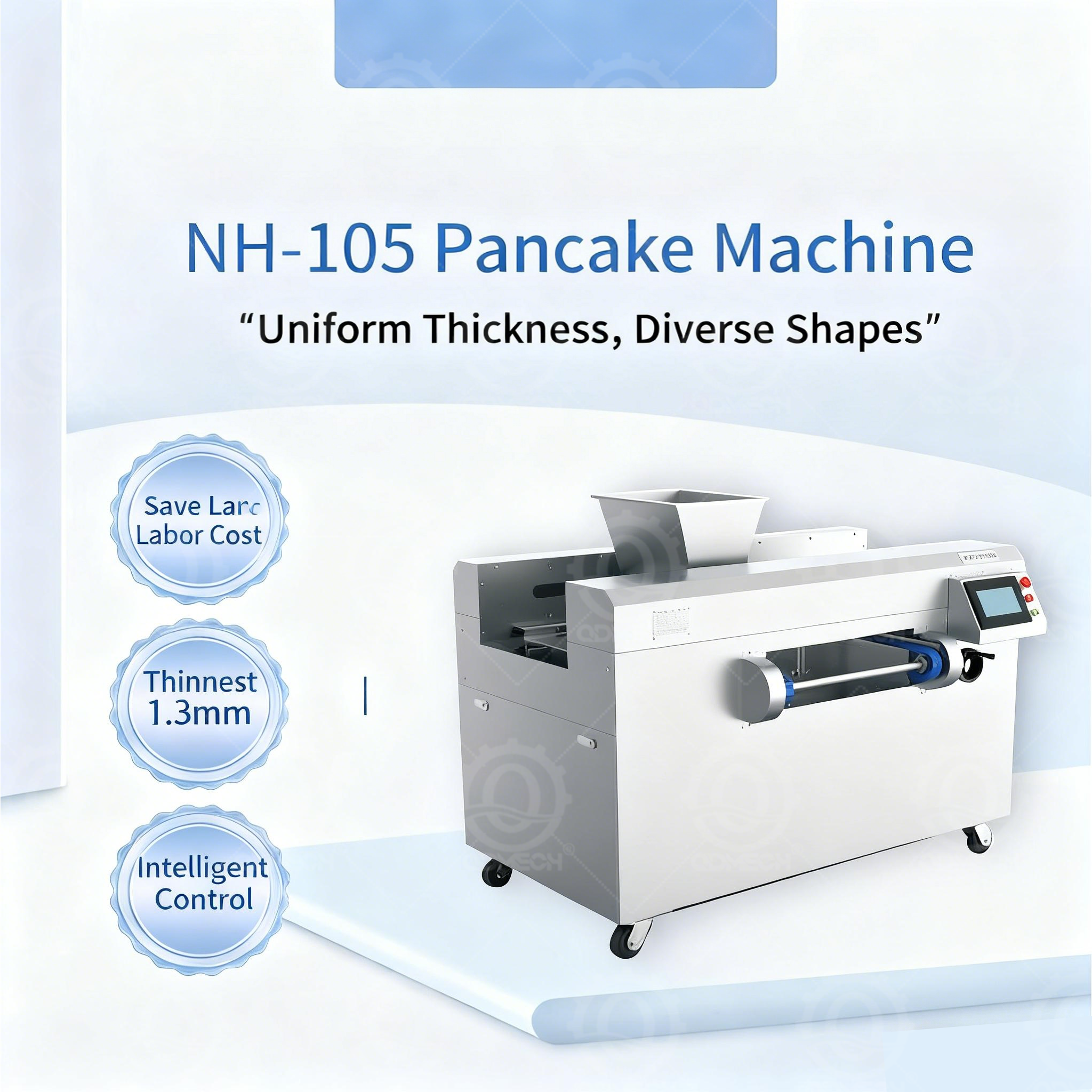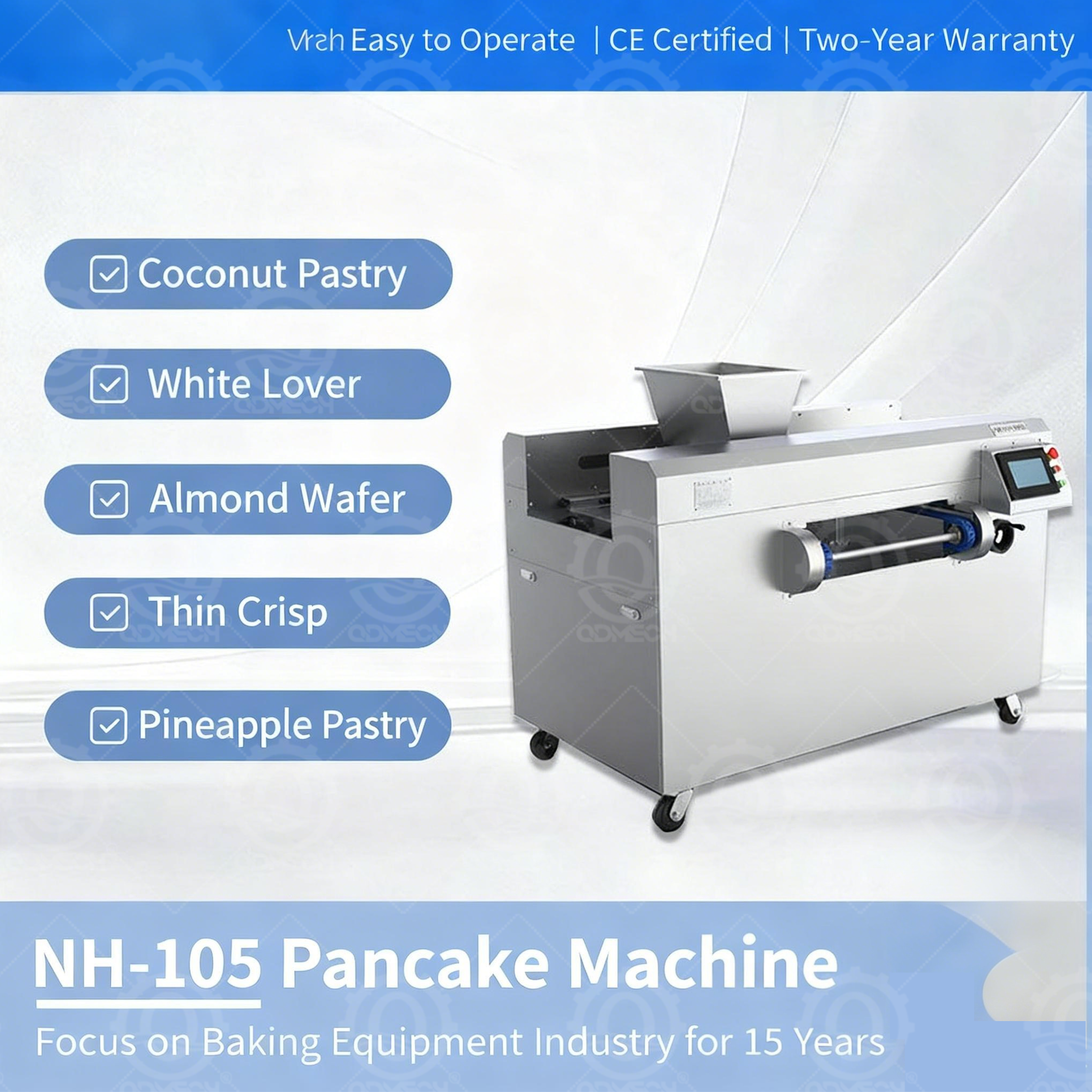 The NH-105 Commercial Pancake Machine,Biscuit Making Equipment, constructed from 304 stainless steel, operates at 220V voltage and 1000W power, delivering a production speed of 300-400 pans per hour. It comes equipped with 2 sets of molds as standard accessories, has a net weight of 400kg, and features external dimensions of 156012001300mm.