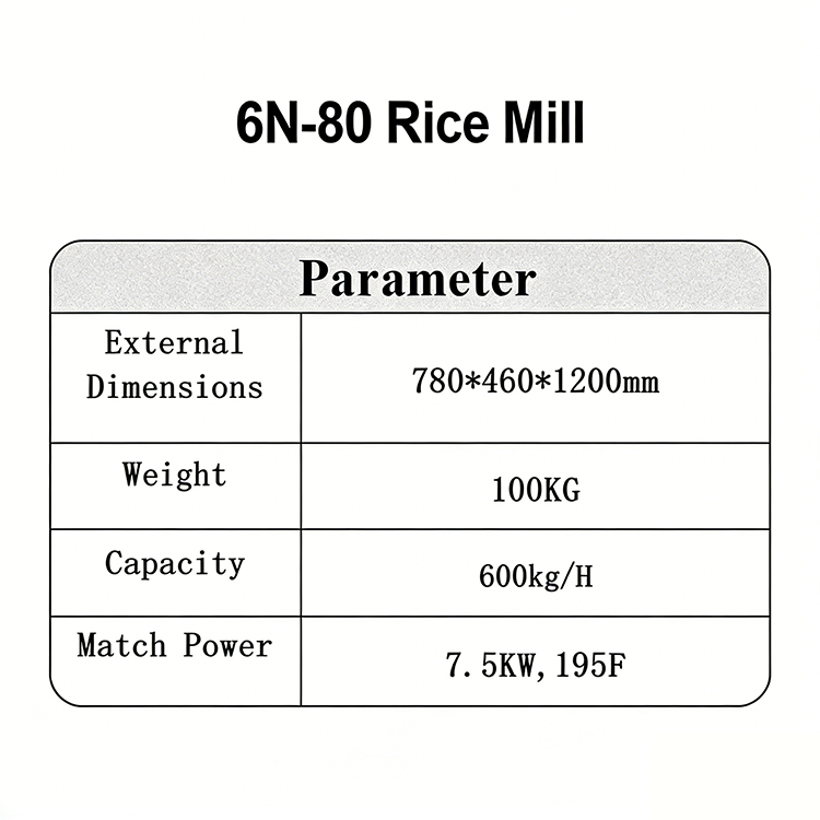The QD-6N-80 Rice Mill is a compact and high-efficiency rice processing machine with an overall dimension of 780×460×1200mm and a net weight of 100Kg, it is configured with a 7.5KW (195F) motor to ensure stable and energy-efficient operation, and it features a high processing capacity of 600kg per hour, making it ideal for small to medium-sized rice mills, rural family workshops, grain warehouses and agricultural cooperatives.